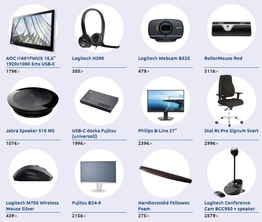 Detta är exempel på jobba hemma-produkter, kan vara beställningsvara med varierande leveranstid. Självklart har vi många andra produkter i vårt sortiment.